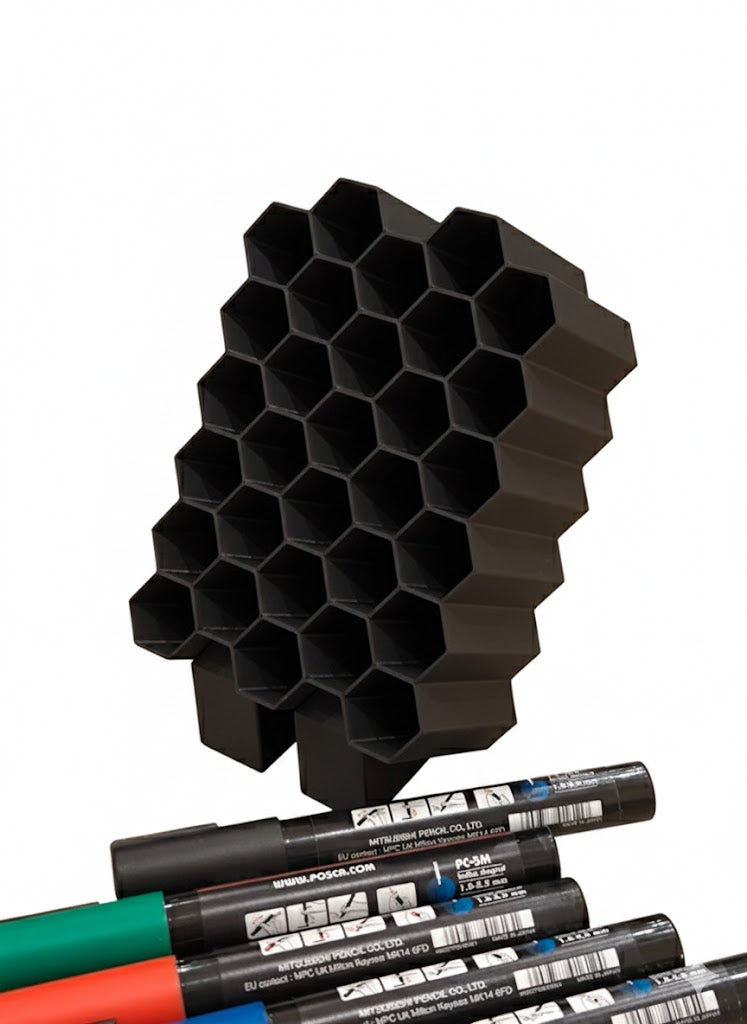 De organizer is 3D‑geprint op bestelling en perfect voor gebruik op een bureau, hobbytafel of atelier. Door het minimalistische design past hij in vrijwel elke creatieve werkruimte.